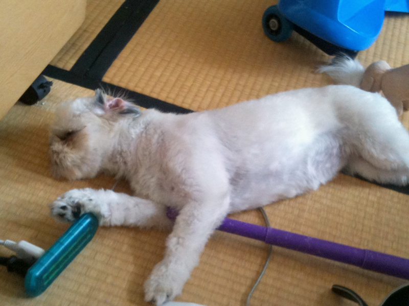 9月といってもまだまだ暑い! ベルは家の中の涼しいところを探して寝ます。今日は子ども部屋がいいみたいですが… たまには掃除し〜や〜