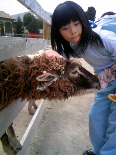 エサで羊の注意をひきつつ、あたまをヨシヨシさわっているあやちゃんです。